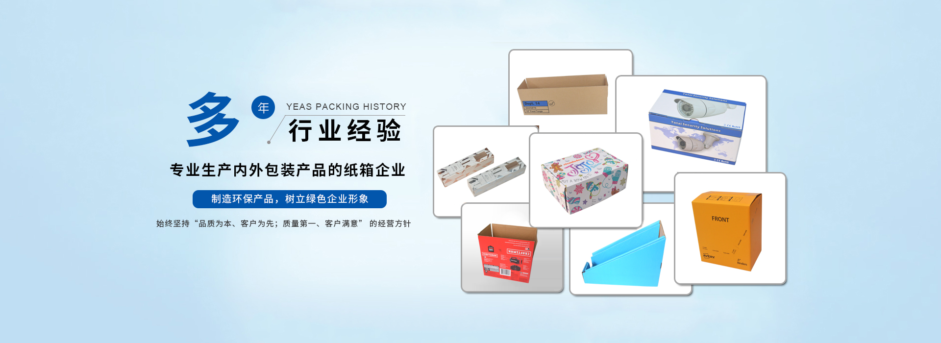 我司主要生產(chǎn)瓦楞紙箱、隔板,禮品盒、彩盒,啤盒;啤卡 ,紙護(hù)角 ,紙卡板,說(shuō)明書(shū),不干膠,珍珠棉,輔助包材集生產(chǎn)和銷(xiāo)售于一體;公司在材料采購(gòu)、生產(chǎn)控制、成品檢驗(yàn)、售后服務(wù)包裝需求嚴(yán)格執(zhí)行ISO9001質(zhì)量體系標(biāo)準(zhǔn);我公司目前為SONY,欣旺達(dá)電子,嘉盛照明,庫(kù)偉實(shí)業(yè),洲明節(jié)能科技; 泛美照明科技, 怡化金融設(shè)備,美利龍餐具,中天世紀(jì),東芝電器 ,共進(jìn)電子等大中型企業(yè)公司配套供應(yīng)包裝紙箱,建立了穩(wěn)定的合作關(guān)系。